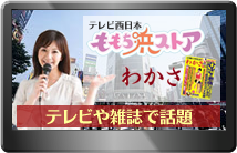エミューオイルは、雑誌の「わかさ」や新聞「日刊ゲンダイ」などでも取上げられ、最近では福岡のローカル情報番組「ももち浜ストア」では、エミュームとエミューの雫が取上げられました。番組終了後は、大変多くのご購入をいただきました。
